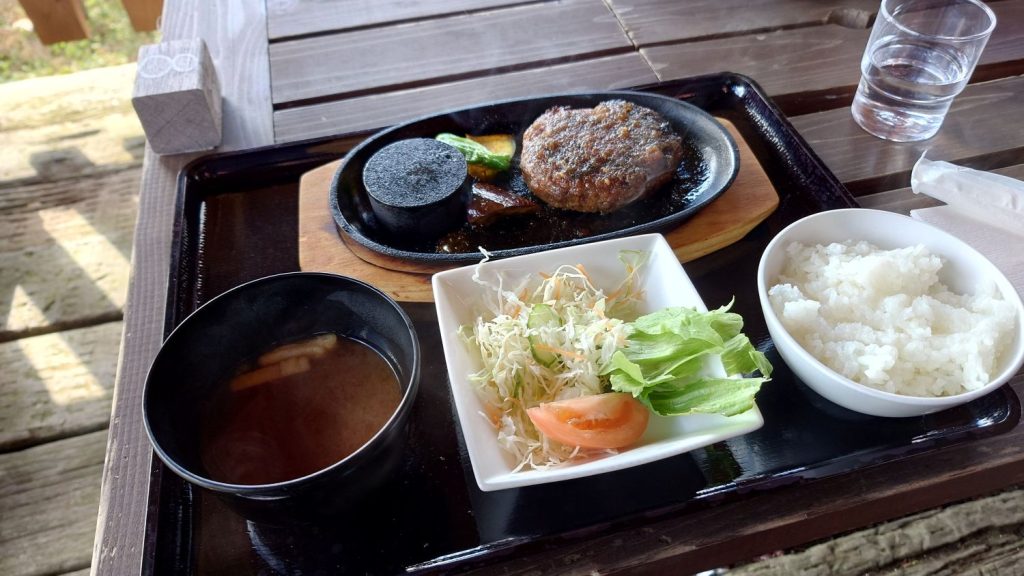 このお店を訪れるのは今回で2回目。前回は迫力のある大きなステーキをいただきましたが、今回はハンバーグ定食を注文してみました。屋外で食べたせいか、少しハンバーグがぬるく感じましたが、味はとても美味しかったです。