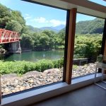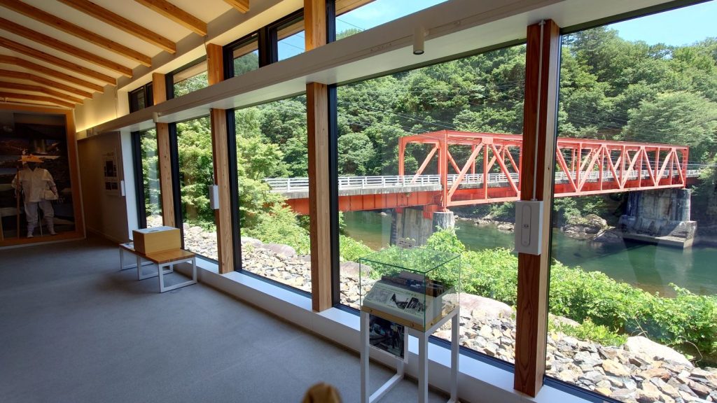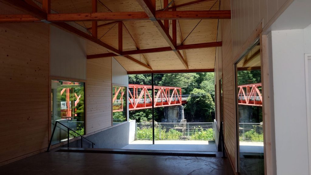 建物の中に入るとテラスがあり、大きな窓からは赤い鉄橋や清流が見えて、とても雰囲気のよい景色が広がっていました。