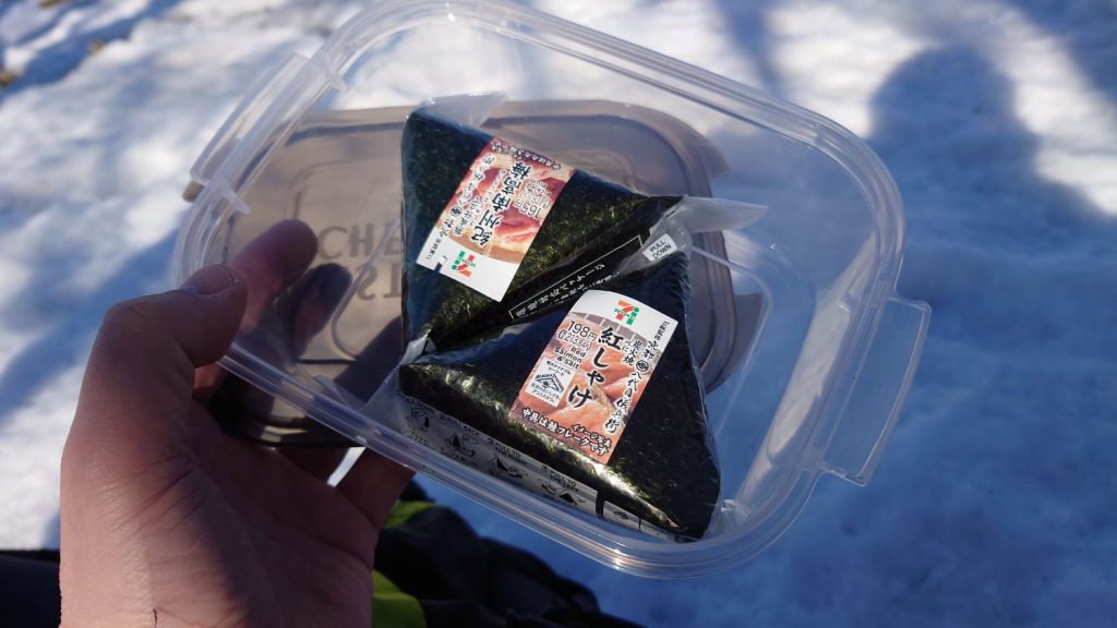 昼食はレストランが激混みになるため、あらかじめ用意しておいたコンビニのおにぎりで済ませます。山頂で景色を眺めながらおにぎりを頬張り、そのままほとんど休憩も取らず、気づけばトータルで6時間近く滑っていました。