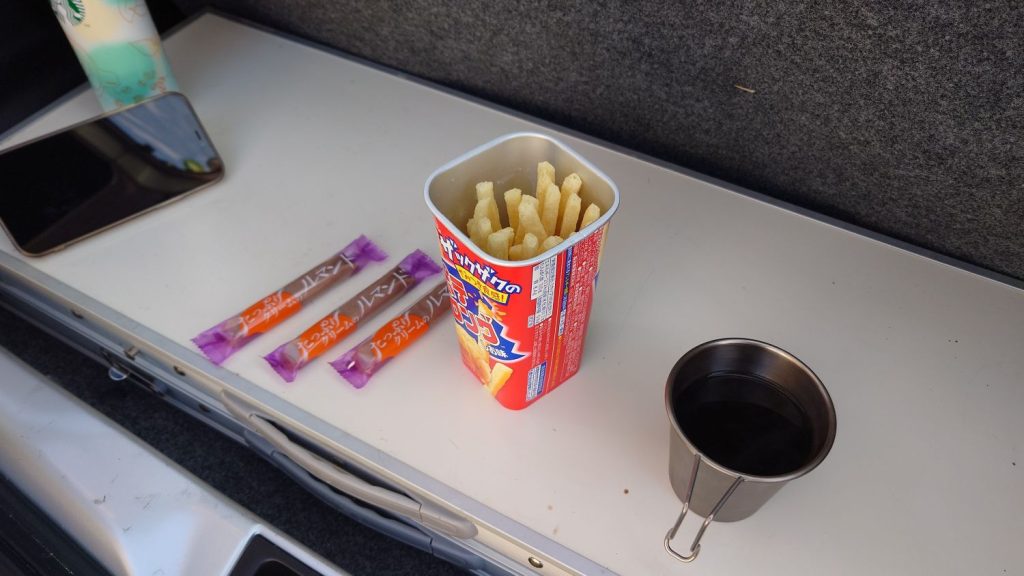 その結果、体はもうガタガタ。滑り終えたあとは、おやつにお菓子をつまみながらコーヒータイムでひと息つきました。本当は帰りに温泉へ寄るつもりでしたが、あまりの疲労にそのまま直帰しました。