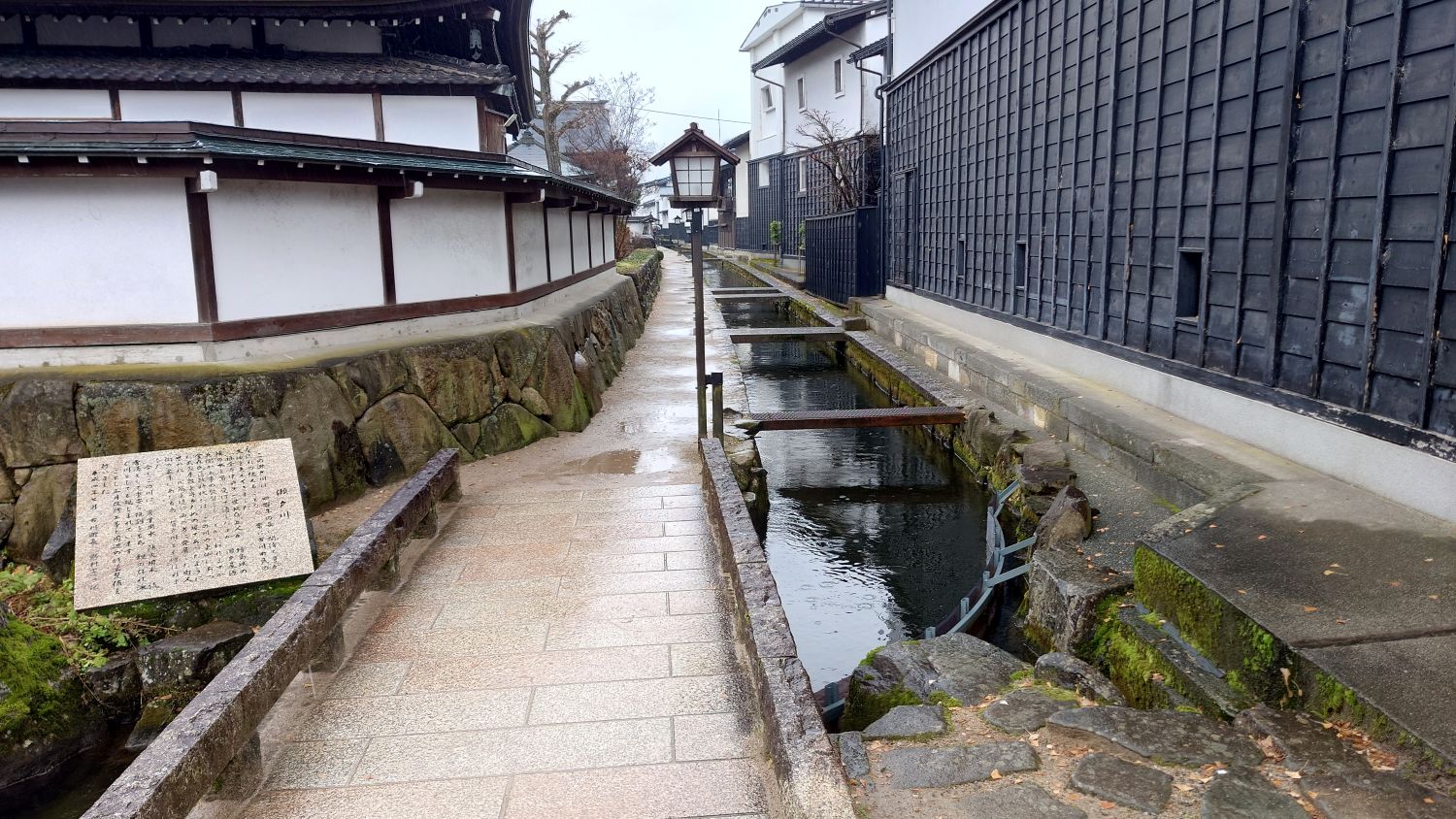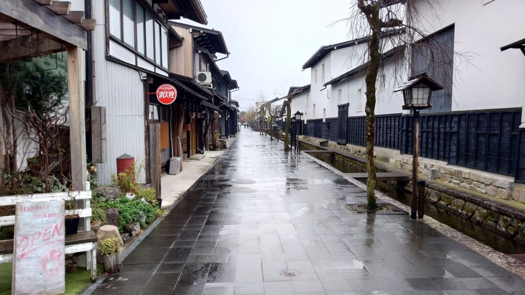 仕方がないので、雨の中を散歩してみることにしました。テレビやYouTubeで紹介されていた場所を歩いてみると、小雨に濡れた飛騨の町並みはしっとりとしていて、想像以上に趣のある景色でした。濡れた小道や静けさが相まって、どこか情緒的で、とても良い雰囲気を感じることができました。