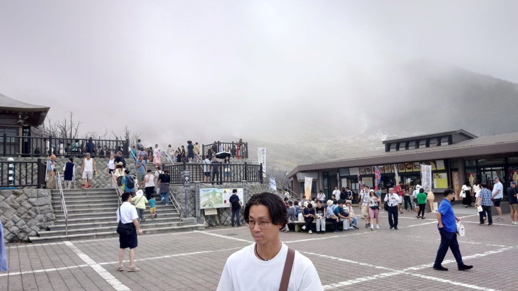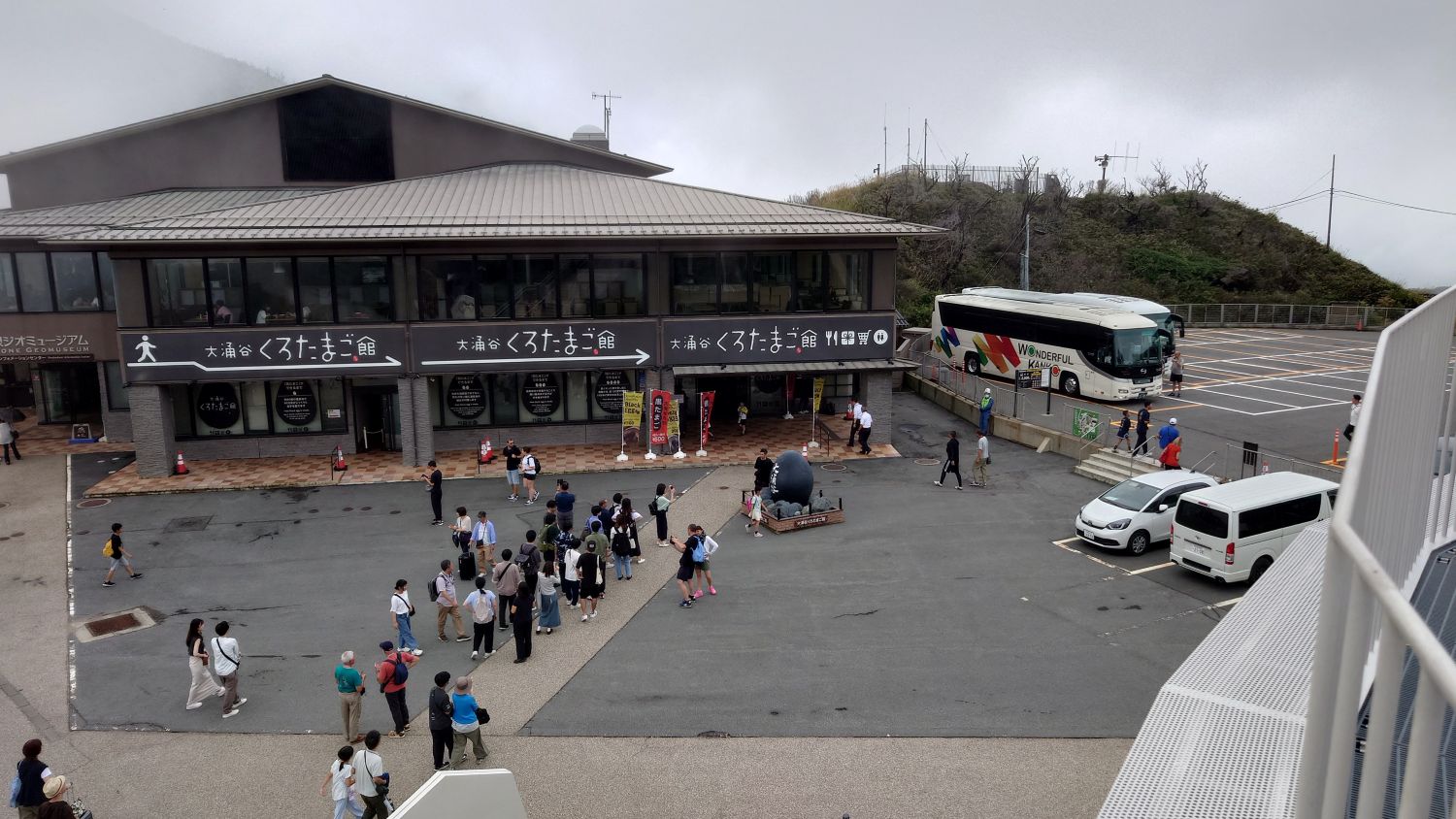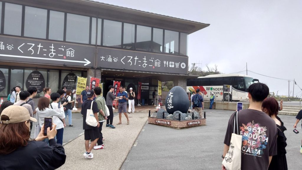 さて、景色はさておき大涌谷公園を散策していると、黒くて丸いモニュメントの前に行列ができているのを発見。近づいてみると、大涌谷名物・黒い温泉卵のモニュメントでした。観光客が記念撮影をするために並んでいたようで、列のほとんどが外国人観光客でした。