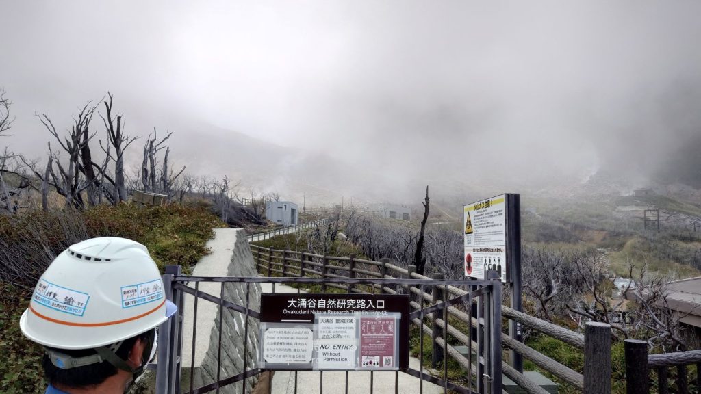 さらに奥へ進むと、本来なら山の上まで歩いて登れるルートがあるはずなのですが、なんと今日は閉鎖中!硫黄ガスの濃度が高く、危険な状態だったようです。