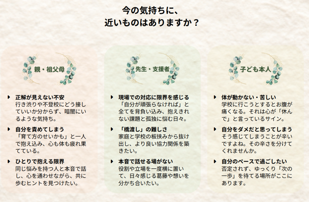子育ての不安や、不登校・発達のお悩みから生まれる孤独感。
