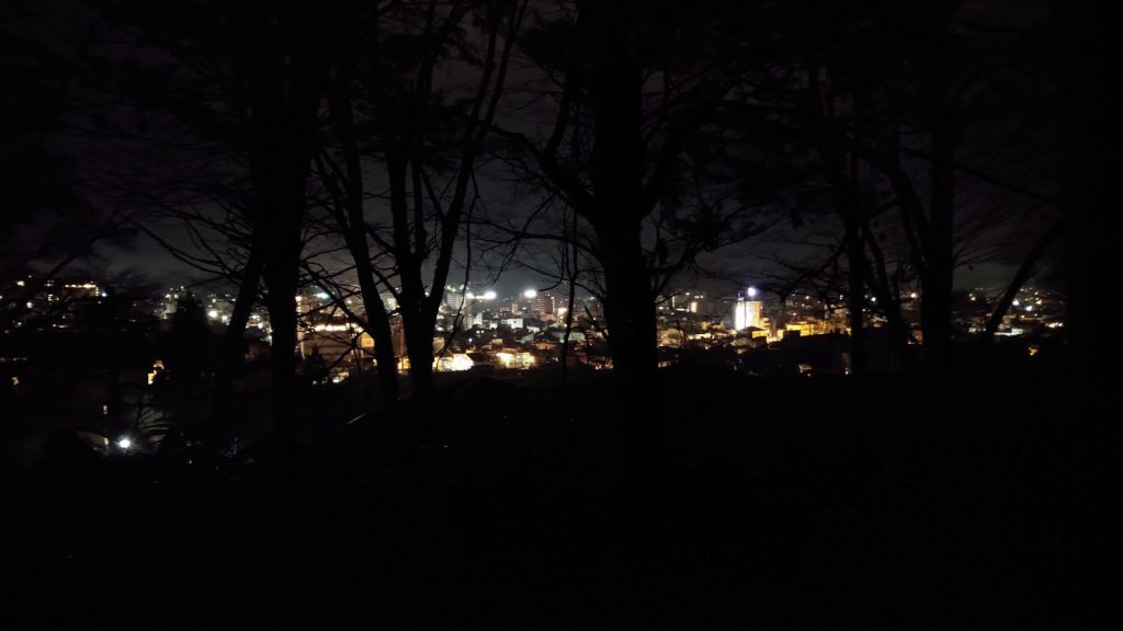 それでも何とか登りきり、高山の夜景を撮影。スマホなのであまり綺麗には撮れませんでしたが、目的は達成です。