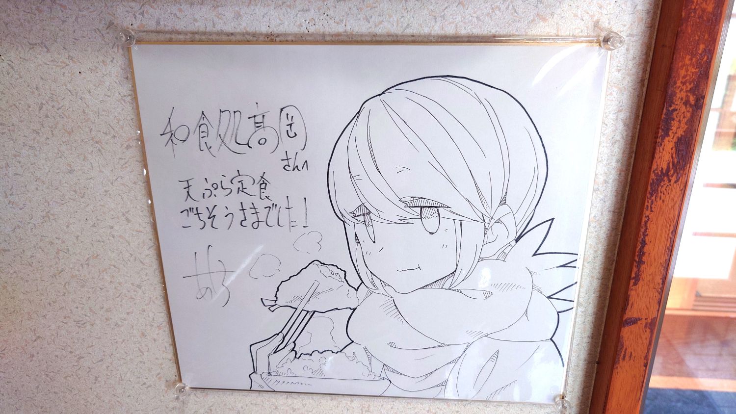 今回は、山梨県北杜市に位置する和食処「高岡」を再度訪れてみました。前回は臨時休業で悔しい思いをしましたが、今回はやっと食事をすることができました。まずはこのお店、前回も紹介した通りアニメ「ゆるキャン」のスピンオフで主人公「志摩リン」がバイクの旅途中に寄り道をして、てんぷらを食べていました!やっと念願かなって店内で食事をすることができました。入店すると早速「ゆるキャン△」のサイン色紙が飾られていました!店内は込み合っていましたが、お店の店員さんが、すぐ作るからまっててと言われたので、早速ぷりぷりのエビ天ぷら蕎麦定食を注文しました。とても美味しかったです((´∀`))店員のおばさんがすごくいい人だったので、また食べに行きますね~